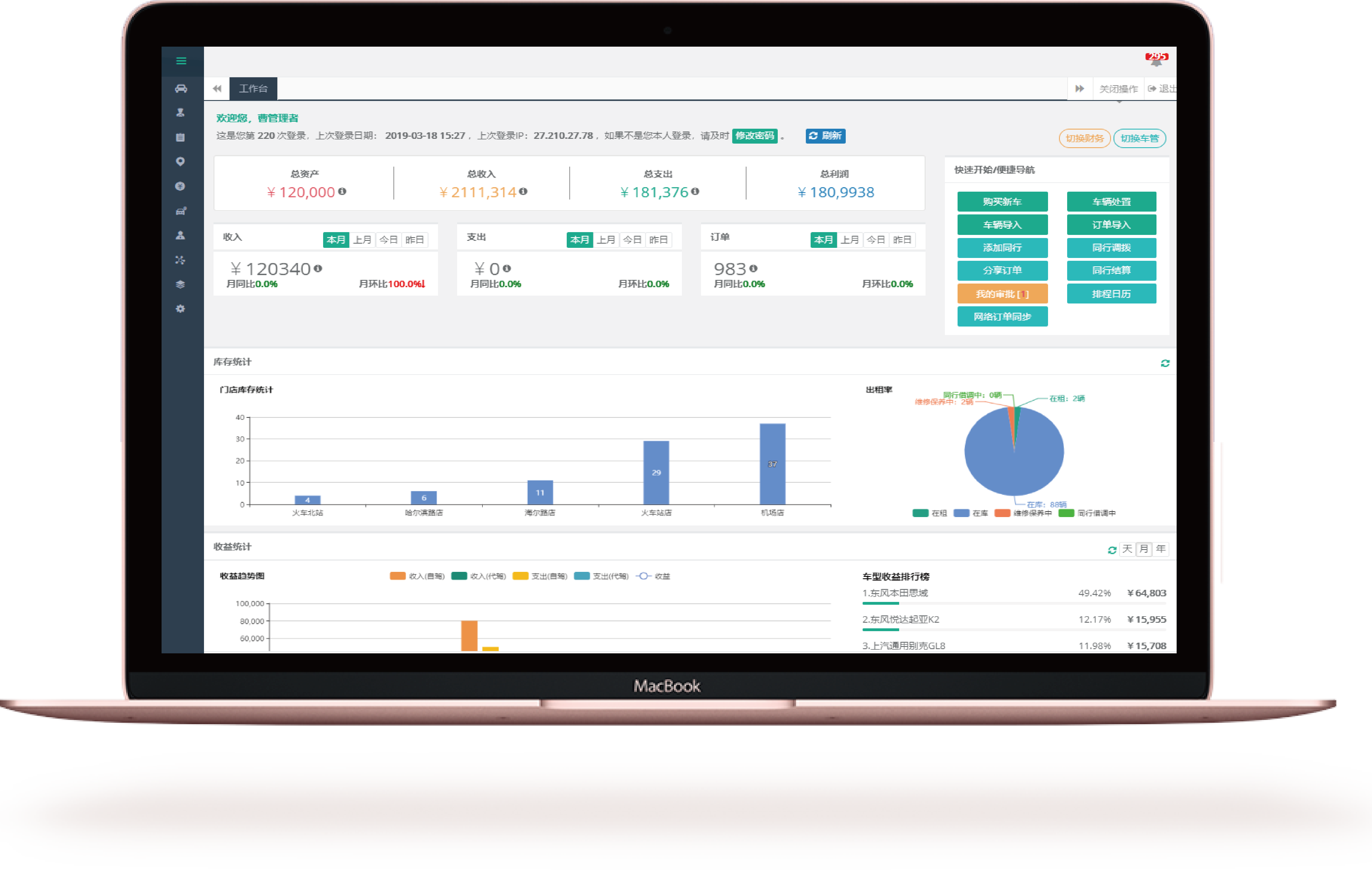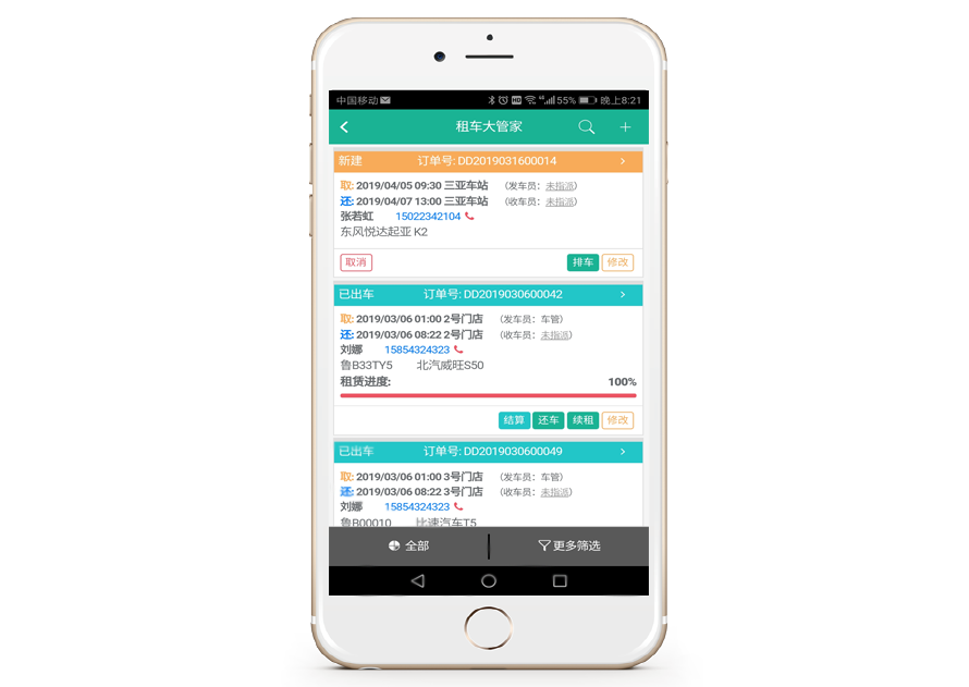 提供基于租车业务驱动的汽车租赁流程的全周期业务流程管理,包括资产管理、订单管理、财务管理、GPS位置管理、违章管理、门店/同行/员工管理等;支持多渠道消息推送,包括邮箱、微信、短信、钉钉、平台等多种推送方式,用户关心的数据可及时推送,即使不登录系统也可及时掌握公司运营情况;系统预置管理者、车管、财务角色。支持个人订制通知待办、提升内部协作效率;提供丰富 的多维数据聚合的图表,辅助并指导日常经营;专业的财务管理模块,从租赁收支到车辆成本、公司费用等实现事前预算控制、事中核算、事后分析统计,方便灵活,开箱即用。