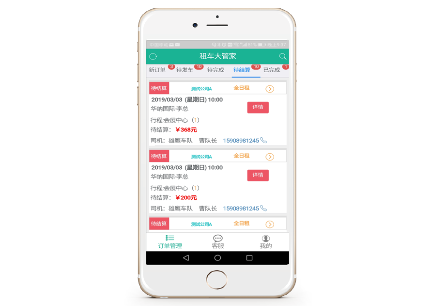 独立的代驾模块,能更专业更有针对性的管理各种代驾业务,商家可通过代驾模块管理司机、管理订单、分派司机并可共享行程中司机的手机定位,及时掌握订单进度; 金领车管代驾版结合司机端APP,构建从商家下单到司机接单、出车、结算、运营分析的代驾业务闭环; 提供专业的财务管理模块,帮助商家更高效的进行财务管理,财务模块包括会议用车结算、零散用车结算、司机结算、企业客户结算及财务报表等丰富的功能。
